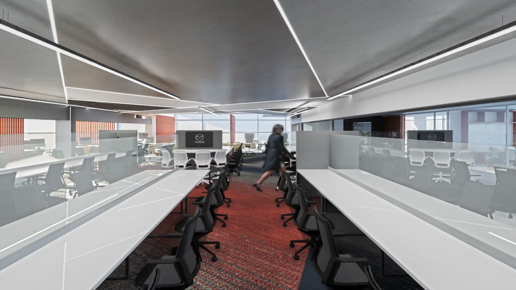 Proyecto de remodelación de oficinas para Mazda en Santa Fe, concebido para reflejar la esencia dinámica y elegante de la marca, el diseño integra líneas limpias, materiales de alta calidad y una paleta sobria, generando espacios funcionales que transmiten innovación, precisión y movimiento, en sintonía con la identidad corporativa.